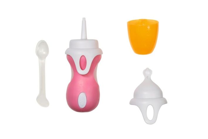 Kdo potřebuje celou kuchyňskou skříň plnou nádobí? Panenka BABY born určitě ne. Má svou lahvičkou s integrovanou lžičkou. Jeden nástavec se používá na pití, při kterém je slyšet zvuk sání. Druhý nástavec je zakončen lžičkou. Kaše pro panenku BABY born se z lahvičky vytlačí otvorem ve spodní části nástavce se lžičkou a vše je připraveno k jídlu. Dobrou chuť!