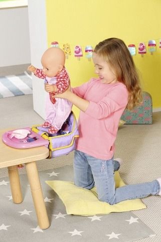 Hmmm, mňam. Máme tu kašičku pro BABY born a lahvičku s vodou. A co to jedí ti dva? Malá labužnice dává dobrý pozor, když sedí ve své jídelní židličce. Sedátko může být připevněno ke stolu o tloušťce 15 – 40 mm, takže BABY born může při jídle sedět u stolu. Fialovo-žlutá sedačka je pohodlný a měkká, zatímco masivní deska je vhodná i ke hraní a kreslení. Kačenka Berta a medvídek Bruno také rádi jedí a jsou nadšeni, že mohou být u jídla společně. Pro ty dva to byla láska hned při prvním soustu. Dobrou chuť! • Originální doplněk pro panenky BABY born. • Pro nápaditou, rozmanitou a dlouhotrvající hru. • Vhodné i pro menší panenky. BABY born Jídelní židlička s uchycením na stůl s tloušťkou desky 15 – 40 mm.