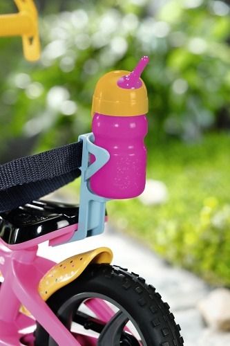 BABY born se se svým kolem vydala do bikeparku. Má totiž terénní kolo. S pneumatikami s terénním profilem, které dokážou přejet přes všechny překážky a také všechny rampy. Růžové kolo je vybaveno žlutými blatníky s barevnými puntíky, aby pak na oblečení nebyly tolik vidět cákance bláta. Klakson ve tvaru kačenky a světlo ve tvaru medvídka jsou díky zvuku a blikajícímu světlu zárukou toho, že BABY born nikdo nepřehlédne. Žluté pásky na ruce a nohy a bezpečnostní popruh udržují malou závodnici pevně v sedle. Stabilizační kolečka zaručují nezbytnou rovnováhu. Přijde-li po cestě žízeň, je zde ještě barevně sladěná láhev na kolo. • Kvalitní doplněk pro originální panenku BABY born. • Se světelným ekektem. • Pro radost z nápadité, rozmanité a dlouhotrvající hry. • Vhodný i pro menší panenky. • Funguje na baterie (nejsou součástí). BABY born Kolo s pásky pro připoutání panenky, klaksonem a blikajícím světlem. Součástí je láhev.