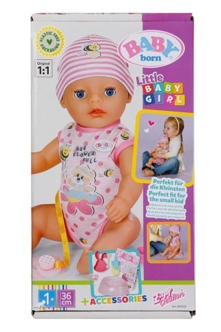 BABY born Little, holčička, má 7 skvělých funkcí, které fungují bez baterií. Je dodávána se vším, co potřebuje. Může pít vodu z lahvičky, nechat se přebalovat nebo chodit na růžový nočník. Když dostane dudlík, který je stužkou připevněn k dupačkám, kouzelně se jí otevřou nebo zavřou oči. Pokud dudlíkem otočíte doleva, zavře oči, pokud jím otočíte doprava, oči otevře. Pokud ji uložíte ke spánku do její postýlky, zavře oči i bez dudlíku. Má pohyblivé ruce, nohy a hlavu a převlékání oblečků je tak zábavnou dětskou hrou. Díky velikosti 36 cm je vhodná pro malé ručičky dětí od jednoho roku a je ideální panenkou pro začátky hraní si s panenkou – miminkem. Mohou spolu se svou malou maminkou dokonce sedět každá na svém nočníku a BABY born dětem pomůže při učení se na nočník.