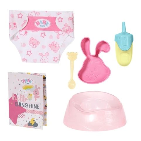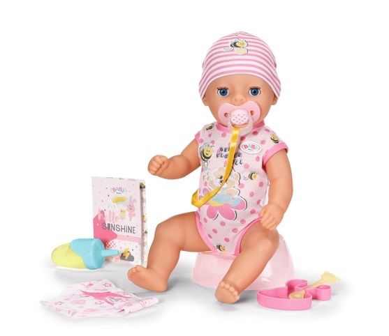 BABY born Little, holčička, má 7 skvělých funkcí, které fungují bez baterií. Je dodávána se vším, co potřebuje. Může pít vodu z lahvičky, nechat se přebalovat nebo chodit na růžový nočník. Když dostane dudlík, který je stužkou připevněn k dupačkám, kouzelně se jí otevřou nebo zavřou oči. Pokud dudlíkem otočíte doleva, zavře oči, pokud jím otočíte doprava, oči otevře. Pokud ji uložíte ke spánku do její postýlky, zavře oči i bez dudlíku. Má pohyblivé ruce, nohy a hlavu a převlékání oblečků je tak zábavnou dětskou hrou. Díky velikosti 36 cm je vhodná pro malé ručičky dětí od jednoho roku a je ideální panenkou pro začátky hraní si s panenkou – miminkem. Mohou spolu se svou malou maminkou dokonce sedět každá na svém nočníku a BABY born dětem pomůže při učení se na nočník.