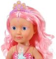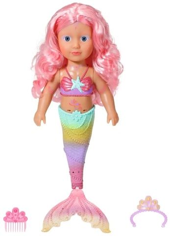 BABY born Little Mořská princezna 46 cm je skvělým příkladem pestrobarevných tvorů žijících pod vodní hladinou. Její ploutev je nádherně barevná a třpytivá. Při kontaktu s vodou se dokonce hýbe. Horní díl plavek v mušličkovém designu a barevné obrázky na těle víly barevně ladí s ocasní ploutvičkou. Dlouhé rúžové vlásky má mořská princezna ozdobené fialovou čelenkou. Vlásky lze hřebenem upravit vždy do nového účesu.Ve vodě se hýbe. Na baterie: 3x AAA (nejsou součástí balení)