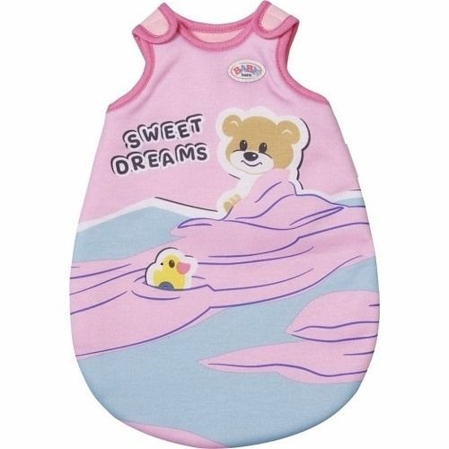 Spací pytel je určen pro panenku Baby Born 36 cm velkou. Je laděný do růžové barvy, v přední části je zdobený Medvídkem Brunem a kačenkou Bertou.