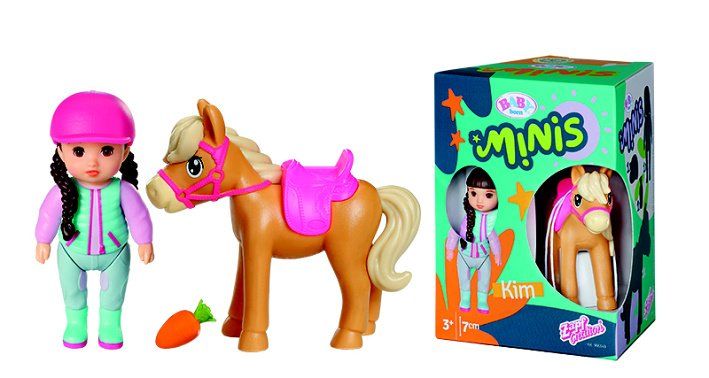 Roztomilá mini panenka Kim je připravena na vyjížďku ve svém elegantním jezdeckém oblečku se slušivou růžovou helmou. Jejímu koníkovi se ale dnes ven moc nechce. Nevadí! Kim totiž ví jak na něj a má připravený trik. Pomocí lahodné mrkvičky koníka chytře v