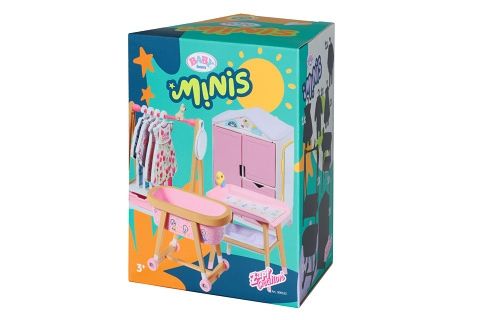 Sada s nábytkem obsahuje vše, po čem panenky BABY born Minis touží: postýlku, přebalovací stůl, skříň, stojan na oblečení a dokonce i 4 outfity na ramínkách. Nově vybavený dětský pokojíček je skvělou základnou pro různá dobrodružství a rošťárny. Panenky BABY born Minis se v pokojíčku cítí jako doma, můžou si tu hrát, spinkat a dovádět. Věk 3+