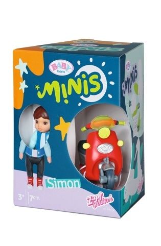 Dávejte pozor! Malý Simon se řití zpoza rohu na svém zářivě červeném skútru. Dokonce i helma dokonale ladí s ležérním městským stylem této mini panenky • Panenka BABY born Minis Simon velikosti 7 cm. • Součástí je skútr a helma.