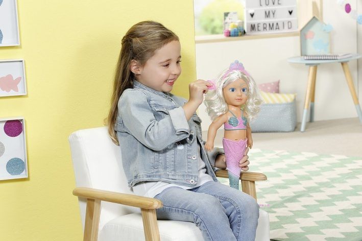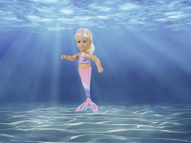 Mořské víly jsou tajemné bytosti a BABY born Mořská víla není výjimkou. Ve vodě vlní barevnou ploutví a elegantně klouže skrz vodu. Jakmile se dostane do kontaktu se studenou vodou, změní se barva oblečku: růžová na tyrkysovou a tyrkysová na modrou. Jak jen to dělá? V dlouhých blonďatých vláscích má barevné pramínky. Vlásky má ozdobeny čelenkou. Součástí balení je také růžový hřeben, který pomáhá při tvoření krásných účesů. • BABY born Mořská víla. • Ve vodě se hýbe. • S efektem změny barvy. • Rozmanitá “hra na” s panenkou BABY born povzbuzuje představivost a bylo prokázáno, že podporuje vývoj sociálních dovedností a hodnot jako je odpovědnost, komunikace a empatie. • Funguje na baterie. BABY born Mořská víla, 46 cm. Součástí je hřeben a čelenka. Na baterie: 3x AAA (nejsou součástí balení)