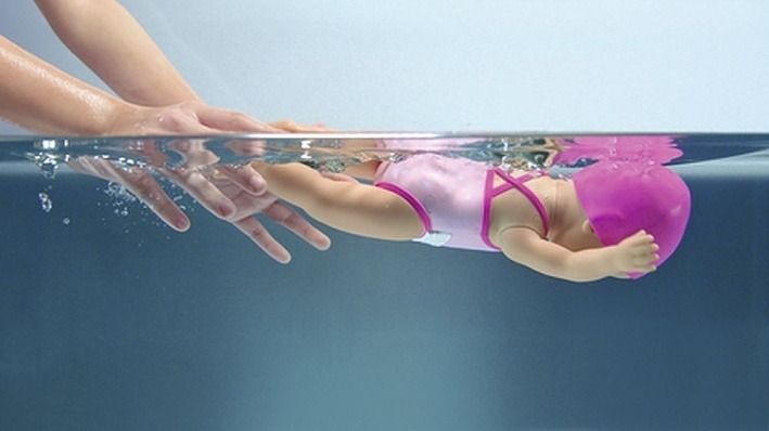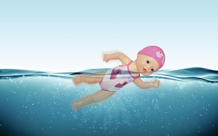 Malá holčička už se toho na hodině plavání tolik naučila. Nejraději má kraul a motýlka. Když plave kraul, střídá ve vodě jednu ruku za druhou, u motýlka rukama hýbe nastejno. A vše bez baterií! Stačí panence natáhnout ruce dozadu a je připravena na další