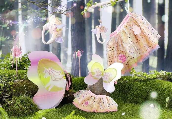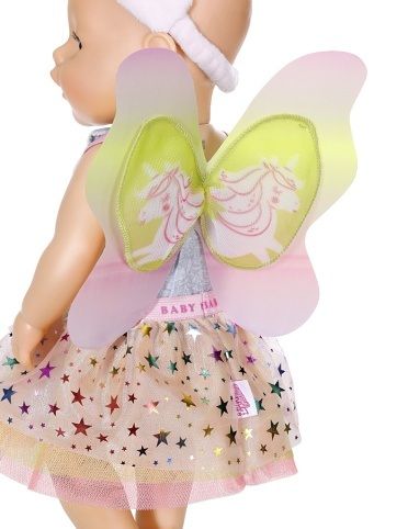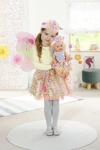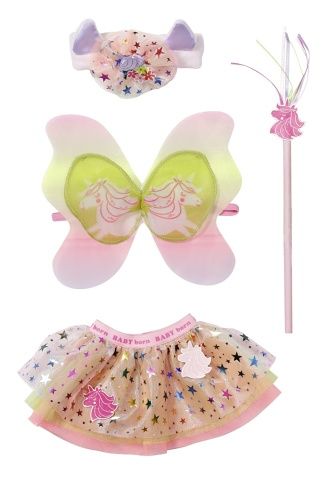 Stačí mávnout kouzelnou hůlkou a na světě jsou dvě nádherné jednorožčí princezny. Není to ale tak jednoduché. Aby byla proměna kompletní, musíš se spolu se svou panenkou převléct. Souprava se skládá ze stejného oblečení pro panenku i pro holčičku. Tylové sukýnky zdobí třpytivé kamínky a nášivky s jednorožci. Čelenky s roztomilými oušky jsou ozdobeny jednorožčím rohem. Není třeba zdůrazňovat, že špičky kouzelných hůlek zdobí jednorožec a barevné třásně. Aby bylo vše dokonalé, obě princezny nosí křídla v pastelových barvách. Souprava je vhodná pro holčičky vysoké 98 až 116 cm. • Originální oblečení a doplňky pro panenky BABY born. • Pro nápaditou, rozmanitou a dlouhotrvající hru plnou zábavy. • Pro holčičky vysoké 98 až 116 cm. BABY born Oblečení ""Jednorožec"" pro panenku i pro holčičku. Součástí je sukýnka, čelenka, křidélka a kouzelná hůlka. Vždy po jednom pro panenku a pro holčičku.