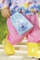 Na procházky s pejskem vyráží BABY born v bundě s barevnými pejsky. Bunda má kapuci a klokaní kapsu. K bundě BABY born nosí ladící růžové kalhoty ušité z odolné látky, ve kterých nevadí, když se namočí nebo ušpiní. Ve žlutých holínkách se může BABY born za deště přebrodit třeba až k psí boudě. Modrá čepice chrání hlavu malé pejskařky. Pejsci se totiž musí venčit, i když je venku zima a mokro. V pytlíčku má BABY born pro svého čtyřnohého kamaráda připravené pamlsky a má tam samozřejmě také uloženy pytlíčky na psí hovínka.