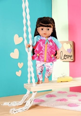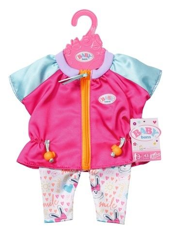 BABY born chodí na setkání s kamarády většinou ve stylovém vycházkovém oblečení, které umožní cokoli a hodí se ke každé aktivitě. Růžová bunda z lesklé látky má tyrkysové vsadky na ramenou a oranžový zip. Když má obleček přesně sedět – například když v něm panenka BABY born visí na prolézačce hlavou dolů – lze bundičku v pase utáhnout gumičkou. Malá parádnice k bundě nosí bílé legíny s barevným potiskem smějící se zaječice Belly. K bundě se skvěle hodí Bellina růžová mašle. • Kvalitní oblečení pro originální panenku BABY born. • Pro radost z nápadité, rozmanité a dlouhotrvající hry. BABY born Oblečení na volný čas růžové pro panenky velikosti 43 cm. Součástí je bunda a kalhoty. Včetně ramínka.