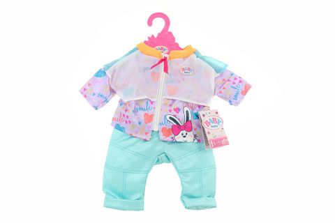 Někdy, když ráno odcházíme z domu, ještě nevíme, co nám daný den přinese. Je tak potřeba mít oblečení, které se bude hodit pro každou aktivitu. Mělo by být sportovní a zároveň nápadité. Pro takové dny má panenka BABY born připravenu pohodlnou bundu ve světle fialové barvě. Část je potištěna barevnými kresbami.Zlatým hřebem outfitu je průhledný svrchní pláštík. K tomu si malá parádnice oblékne lesklé kalhoty v akvamarínové barvě. Švy na kalhotách vypadají skoro jako dlaždičky v bazénu. Věk 3+