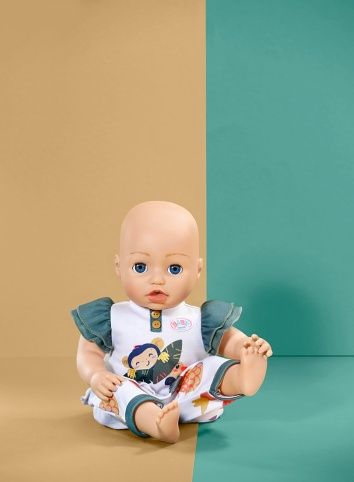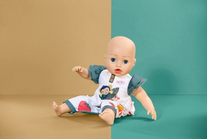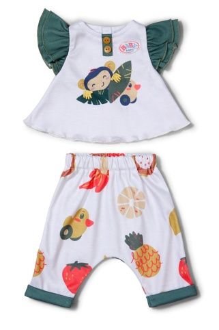 Z trička se zelenými volánkovými rukávy se na tebe usmívá roztomilá opička mezi dvěma banánovými listy. Kalhoty, které k tričku skvěle ladí, jsou potištěny obrázky různých druhů ovoce a kačenky Berty. • Sada trička a kalhot • Tričko i kalhoty jsou ozdobeny roztomilým potiskem opičky, kačenky Berty a ovoce • Tričko s knoflíky a volánkovými rukávy • Vhodné pro panenky velikosti 43 cm a pro medvídky BABY born Teddy • S ramínkem z recyklovaného materiálu • Kvalitní doplněk pro radost z nápadité, rozmanité a dlouhotrvající hry
