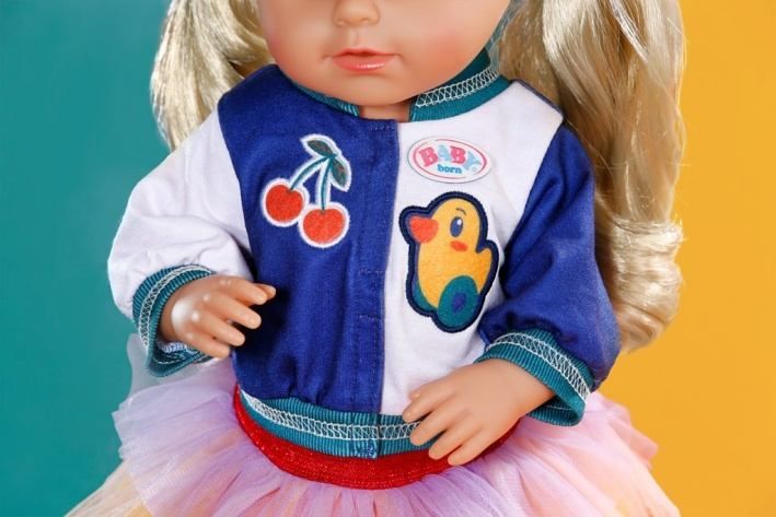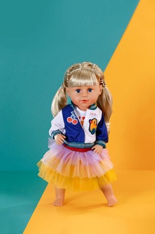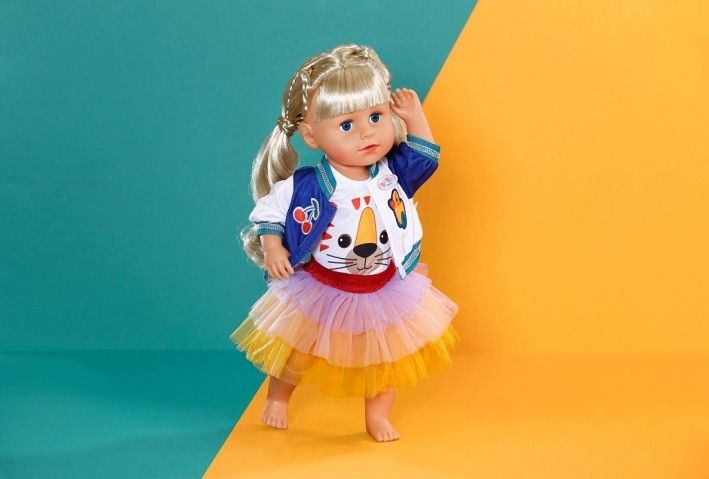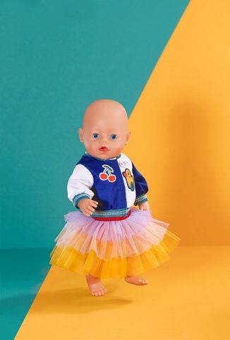 Tričko s tygří tváří, cool dvoubarevná bunda a tutu sukně v barvách žluté, oranžové a fialové – tento outfit přinese zaručeně barevný akcent i do těch nejšedivějších dnů. • Outfit s barevnou tutu sukýnkou, bundou a tričkem • Vhodné pro panenky velikosti 43 cm a pro medvídky BABY born Teddy • S ramínkem z recyklovaného materiálu • Kvalitní oblečení a doplňky pro radost z nápadité, rozmanité a dlouhotrvající hry