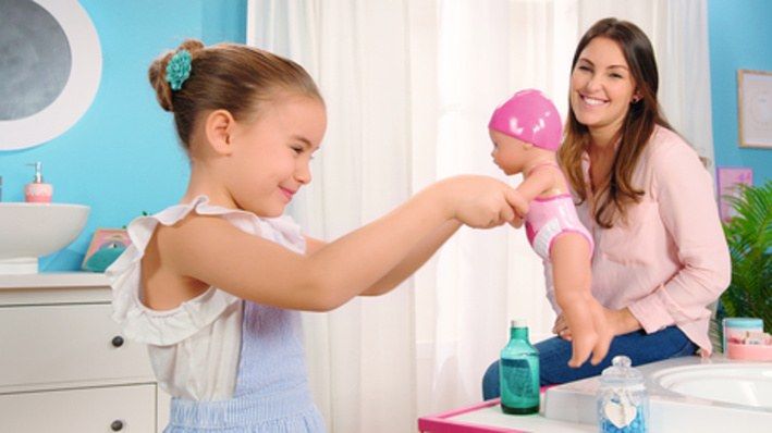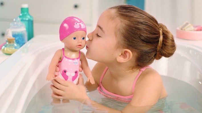 Malá holčička už se toho na hodině plavání tolik naučila. Nejraději má kraul a motýlka. Když plave kraul, střídá ve vodě jednu ruku za druhou, u motýlka rukama hýbe nastejno. A vše bez baterií! Stačí panence natáhnout ruce dozadu a je připravena na další kolo. Když jí ruce uvolníš, začne ve vodě plavat. Nohy a hlava „malého delfína“ jsou také pohyblivé, takže Plaváček může sedět na okraji bazénu a pozorovat svou maminku a tatínka. Plavací čepice a roztomilé plavky s motivem kačenky Berty a s legračními volánky jsou natištěny přímo na těle panenky jako reliéf.•Originální panenka BABY born.•Tělo panenky je vyrobeno z vodotěsného materiálu.•Po otočení ručiček plave kraula a motýlka.• Není třeba baterií.•Velikost 30 cm.•Vhodná pro děti od 12 měsíců.BABY born My First Plaváček ve velikosti 30 cm.