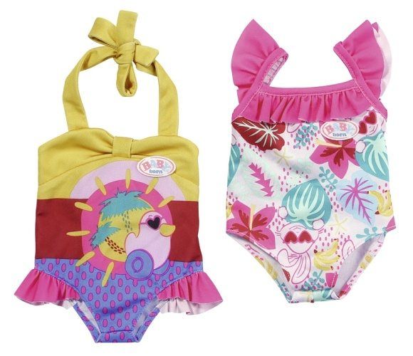 Jsou prázdniny! BABY born to u bazénu i na pláži tak sluší. Jedny z jejích plavek jsou potištěny barevným vzorem amazonského pralesa a ozdobeny růžovými volánky. Na druhých plavkách se sluní kačenka Berta. Žluté zavazování za krk je velmi chytře přišito k horní části krásných jednodílných plavek. • Originální doplněk pro panenky BABY born. • Pro nápaditou, rozmanitou a dlouhotrvající hru. BABY born Plavky pro panenky ve velikosti 43 cm ve dvou různých variantách.