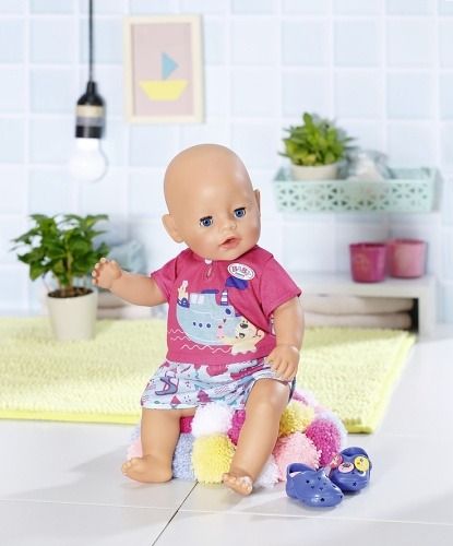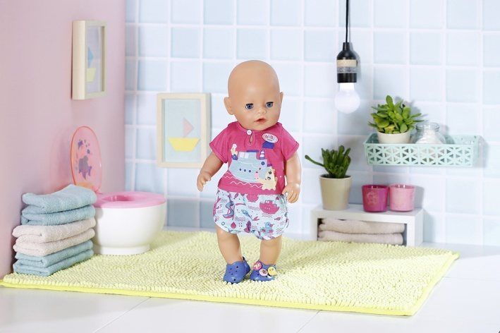 Kapitánka parníku Berta udržuje směr koupelna, zatímco se medvídek Bruno koupe ve vlnách…Takto či podobně by mohla začínat historka, kterou vypráví potisk na horním díle pyžamka. Kalhotky soupravy jsou ozdobeny potiskem akvaparku. Aby nožičky na studených dlaždičkách neprochladly, nosí BABY born modré bačkůrky s roztomilými ozdobami. • Kvalitní oblečení pro originální panenku BABY born. • Pro radost z nápadité, rozmanité a dlouhotrvající hry. • Velmi snadné převlékání. BABY born Pyžamko a bačkůrky pro panenky velikosti 43 cm. Součástí je overal a boty. Včetně ramínka.
