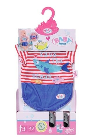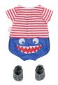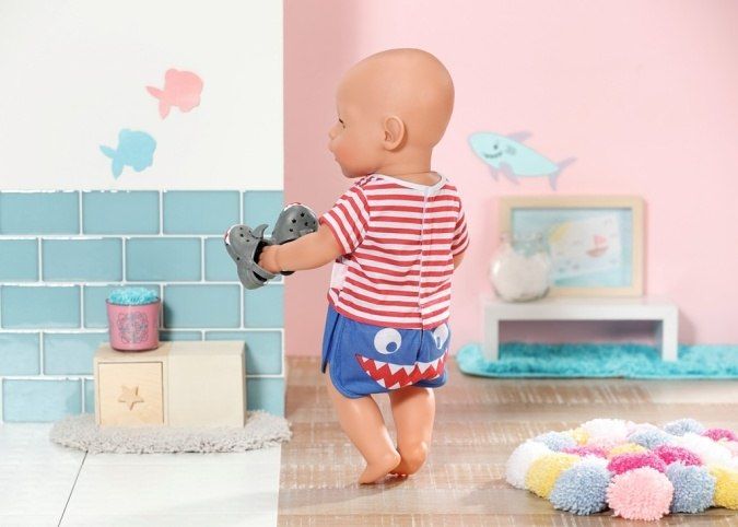 "„Ahoj, BABY born! Už jsi připravená do postýlky?“ BABY born pyžamko vypadá jako námořnický oblek. Na horní části pyžamka jsou červené a bílé proužky. Plavou na nich malé rybičky a přátelský žralok. Námořnicky modré kalhotky perfektně zakryjí zadeček s plenkami. Aby zůstaly nožičky BABY born hezky v teple i když stojí na koupelnových dlaždicích, nosí šedé bačkůrky s ploutvičkou a ozdobou žraločích zubů. • Kvalitní oblečení pro značkovou panenku BABY born. • Pro radost z nápadité, rozmanité a dlouhotrvající hry. BABY born Pyžamko a bačkůrky pro panenky velikosti 43 cm. Včetně ramínka."