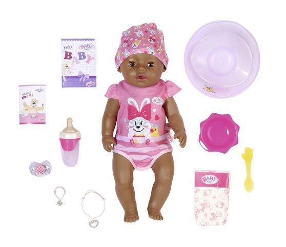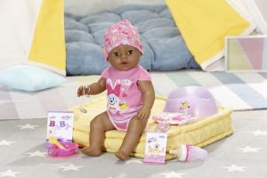 BABY born ze všeho nejraději spí, jí a koupe se. Moc ráda pije vodu ze své lahvičky. Potom se vyčůrá do plenky anebo do nočníku a roní opravdové panenkovské slzy. Stejně jako může BABY born pít vodu, může jíst i kaši. Umí dokonce i kakat. Ruce, nohy a hlava panenky jsou snadno pohyblivé, takže převlékaní oblečků je hračka a skvělá zábava. Tělíčko panenky z materiálu „Soft Touch“ je krásně měkké a příjemné.