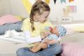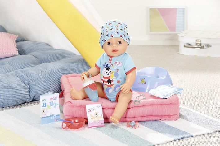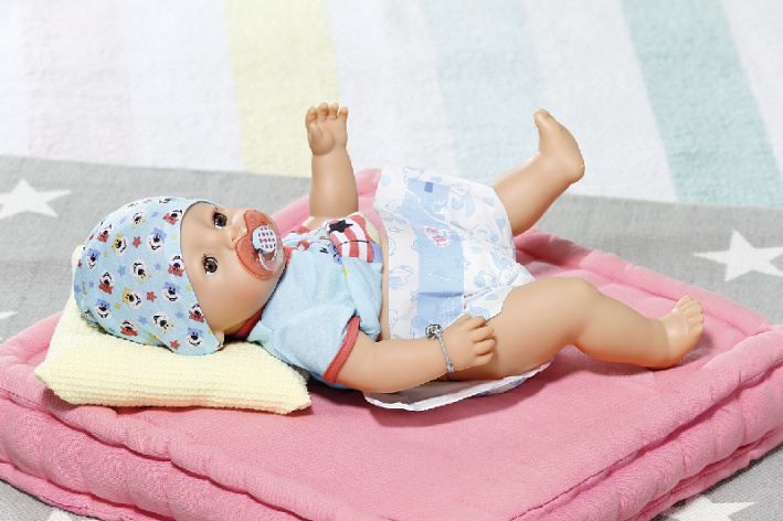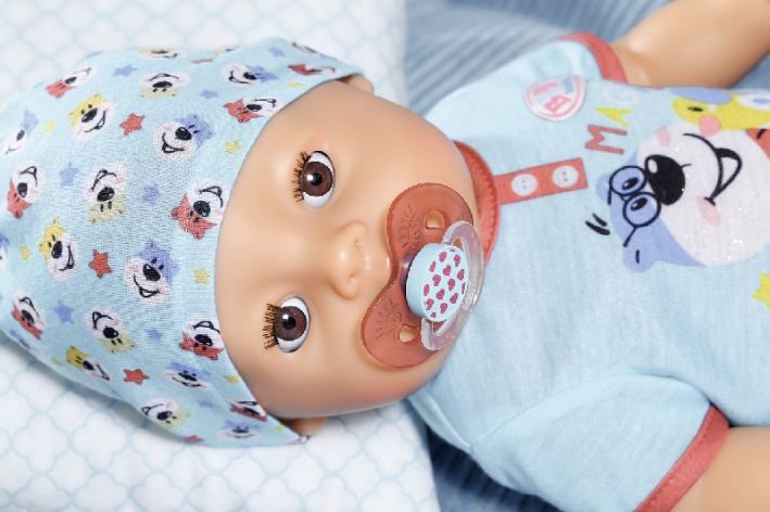 “No panečku, ještě se ti nechce spát?” BABY born chlapeček leží v posteli s očima otevřenýma dokořán a cumlá dudlík. Přišel čas na trik, který by ocenil každý rodič nebo chůva: stačí jen otočit dudlíkem v pusince a BABY born chlapeček hned zavře oči. Kdyby to šlo takhle jednoduše i s opravdovými miminky.Otočení dudlíku panence otvírá a zavírá oči, ať je tělo panenky v jakékoli poloze. Oči panenky jsou zároveň i mrkací. Když se BABY born chlapeček položí na záda a nemá v pusince dudlík, automaticky se mu očička zavřou.BABY born chlapeček ze všeho nejraději spí, jí a koupe se. Moc rád pije vodu ze své lahvičky. Potom se vyčůrá do plenky anebo do nočníku a roní opravdové panenkovské slzy. Stejně jako může BABY born pít vodu, může jíst i kaši. A dokonce umí i kakat. Ruce, nohy a hlava panenky jsou snadno pohyblivé, takže převlékaní oblečků je hračka a skvělá zábava. Tělíčko panenky z materiálu „Soft Touch“ je krásně měkké a příjemné.Součástí balení je 10 doplňků, které podporují funkce pan