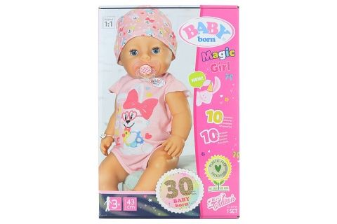 BABY born holčička nedokáže pochopit, proč už musí jít do postýlky. Venku je ještě přece světlo. Maminka a tatínek ale mají skvělý trik: stačí v pusince otočit dudlíkem a BABY born se zavřou oči. Kéž by to bylo tak jednoduché s každým miminkem... Otočení dudlíku panence otvírá a zavírá oči, ať je tělo panenky v jakékoli poloze. Oči panenky jsou zároveň i mrkací. Když se panenka položí na záda a nemá v pusince dudlík, automaticky se jí oči zavřou. BABY born ze všeho nejraději spí, jí a koupe se. Moc ráda pije vodu ze své lahvičky. Potom se vyčůrá do plenky anebo do nočníku a roní opravdové panenkovské slzy. Stejně jako může BABY born pít vodu, může jíst i kaši. Umí dokonce i kakat. Ruce, nohy a hlava panenky jsou snadno pohyblivé, takže převlékaní oblečků je hračka a skvělá zábava. Tělíčko panenky z materiálu „Soft Touch“ je krásně měkké a příjemné. Součástí balení je 10 doplňků, které podporují funkce panenky, růžové body a čepička. Panenka BABY born s kouzelným dudlíkem, holčička, 43 cm, má na sobě body a čepičku. Součástí balení je nočník, plenka, talíř se lžičkou, porce kašičky, lahvička, kouzelný dudlík, rodný list pro panenku a náramky přátelství pro panenku a její malou maminku. Věk 3+