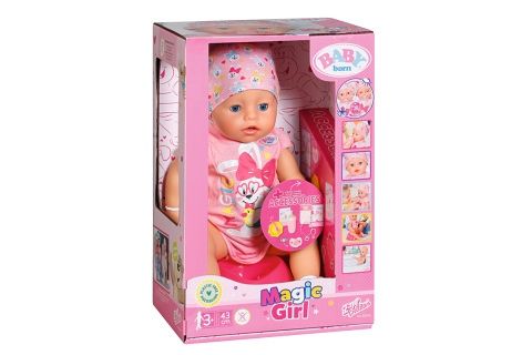 BABY born holčička nedokáže pochopit, proč už musí jít do postýlky. Venku je ještě přece světlo. Maminka a tatínek ale mají skvělý trik: stačí v pusince otočit dudlíkem a BABY born se zavřou oči. Kéž by to bylo tak jednoduché s každým miminkem... Otočení dudlíku panence otvírá a zavírá oči, ať je tělo panenky v jakékoli poloze. Oči panenky jsou zároveň i mrkací. Když se panenka položí na záda a nemá v pusince dudlík, automaticky se jí oči zavřou. BABY born ze všeho nejraději spí, jí a koupe se. Moc ráda pije vodu ze své lahvičky. Potom se vyčůrá do plenky anebo do nočníku a roní opravdové panenkovské slzy. Stejně jako může BABY born pít vodu, může jíst i kaši. Umí dokonce i kakat. Ruce, nohy a hlava panenky jsou snadno pohyblivé, takže převlékaní oblečků je hračka a skvělá zábava. Tělíčko panenky z materiálu „Soft Touch“ je krásně měkké a příjemné. Součástí balení je 10 doplňků, které podporují funkce panenky, růžové body a čepička.Věk 3+