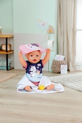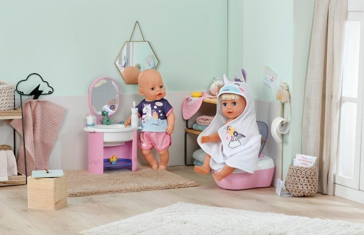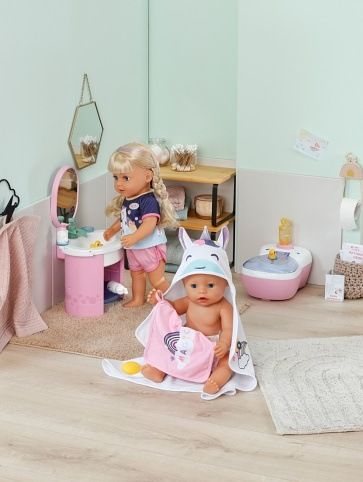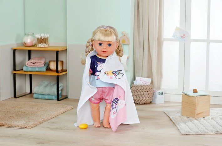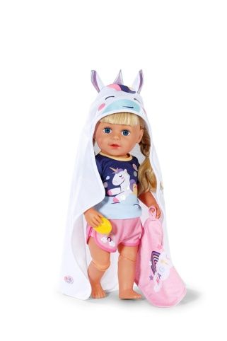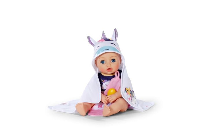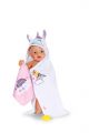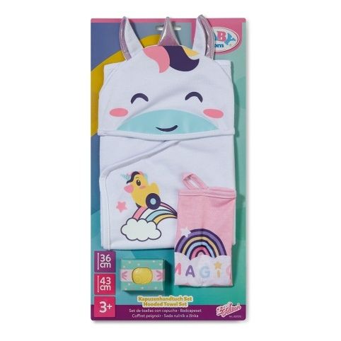 BABY born Sada ručníků s jednorožcem a duhou. • Dva ručníky s motivem jednorožce a duhy • Kapuce s potiskem jednorožce, duhovým rohem a roztomilými oušky • Měkký materiál: zajišťuje příjemný pocit po koupeli • Pro panenky velikosti 36 cm a 43 cm