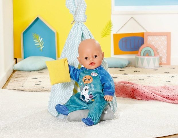 Panenka BABY born někdy prostě jen ráda odpočívá a dopřeje si volný den v pohodlných dupačkách. Její zvířecí kamarád Bruno to předvádí na potisku overalu: jen tak sedět, relaxovat a užívat si života. Akvamarínové dupačky mají rukávy a chodidla v azurové barvě. Také už cítíš ten uklidňující účinek modré barvy? • Kvalitní oblečení pro originální panenku BABY born. • Pro radost z nápadité, rozmanité a dlouhotrvající hry. BABY born Sametové dupačky modré pro panenky velikosti 43 cm. Včetně ramínka.