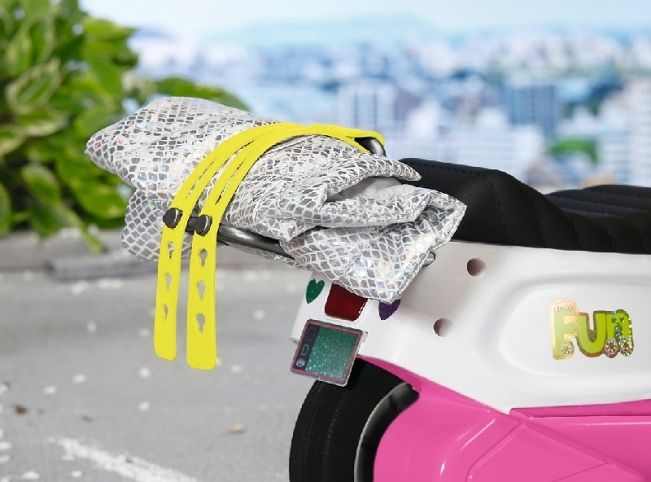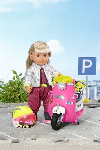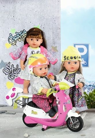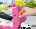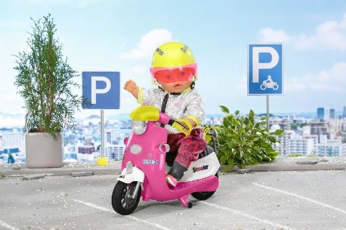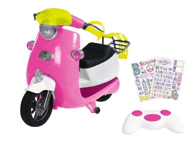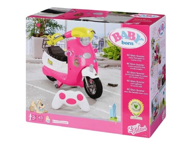 BABY born jezdí po městě nejraději na skútru. Může ho zaparkovat téměř kdekoli a těmi nejužšími tajnými uličkami se rychle dostane z bodu A do bodu B. Růžové vozítko se řídí dálkovým ovládáním. Při zatáčení vlevo a vpravo se rozsvítí blinkry. Díky úchytům na řídítkách sedí BABY born za volantem skútru vždy pohodlně a bezpečně. Zavazadlový nosič nabízí prostor pro jednu či dvě nákupní tašky. A kdo by si chtěl skútr vylepšit přesně podle svého, může jej ozdobit parádními třpytivými samolepkami.•Kvalitní příslušenství pro originální panenku BABY born.•Pro radost z nápadité, rozmanité a dlouhotrvající hry.•Funguje na baterie (nejsou součástí).BABY born Skútr na dálkové ovládání. Součástí jsou třpytivé samolepky.