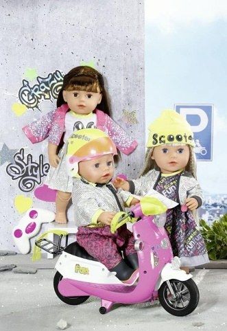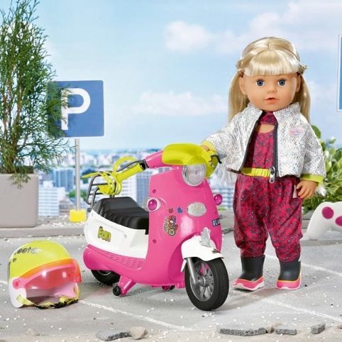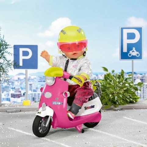 BABY born jezdí po městě nejraději na skútru. Může ho zaparkovat téměř kdekoli a těmi nejužšími tajnými uličkami se rychle dostane z bodu A do bodu B. Růžové vozítko se řídí dálkovým ovládáním. Při zatáčení vlevo a vpravo se rozsvítí blinkry. Díky úchytům
