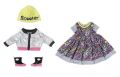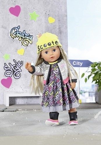 Díky vrstveným šatům a žluté čepici vypadá panenka BABY born v rušných městských ulicích velmi elegantně. Jako ochranu proti větru nosí bundu s lesklým stříbrným vzorem. Parádní boty hrají barvami a dokreslují celkový vzhled. • Maxi šaty v rockovém vzhledu s potiskem. • Moderní bunda s efektem zrcadlení. • Čepice v neonových barvách s nápisem „Scooter“. • Soupravu skvěle doplňují barevně sladěné botičky. • Pro panenky velikosti 43 cm. • Možno prát v ruce ve vlažné vodě. Nesušit v sušičce. • Balení: obal bez plastů – dárková krabice s obrázky produktu.