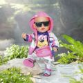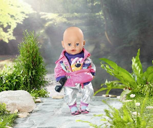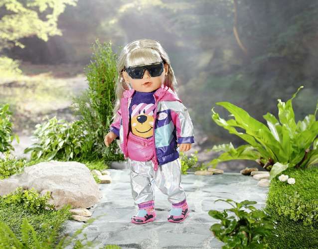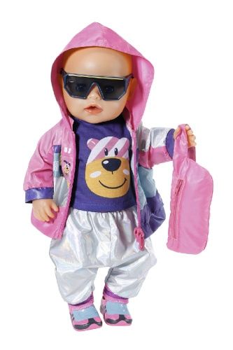 „Tydýýýt!“ To byla startovní siréna Tour de BABY born. Malá závodnice má na závod připraven mimořádně krásný dres. Její mikina s kapucí je ozdobena geometrickými tvary. Geometrické tvary jsou i na slunečních brýlích. K tomu se skvěle hodí tmavé tričko s obrázkem medvídka Bruna. Nad sportovními botami BABY born nosí stříbrné kalhoty, které se na slunci třpytí jako medaile. Přihlášku na závod a energetickou kaši na svačinku si zatím schová do růžové ledvinky. •Kvalitní oblečení pro originální panenku BABY born.•Pro radost z nápadité, rozmanité a dlouhotrvající hry.•Velmi snadné převlékání.BABY born Souprava na kolo Deluxe pro panenky velikosti 43 cm. Součástí je mikina, tričko, kalhoty, boty, ledvinka a sluneční brýle.