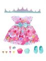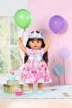 "BABY born by si přála, aby měla narozeniny každý den v roce. To samozřejmě není možné, ale díky tomuto krásnému slavnostnímu oblečku může alespoň slavit a hezky se obléknout tak často, jak se jí jen zachce. Elegantní šaty jsou na rukávech ozdobeny potiskem konfet. Kolem pasu mají nepřehlédnutelnou tyrkysovou mašli, která dokonale ladí s barvou balerín. Zatímco si zvířecí kamarádi na sukýnce hrají s nafukovacími balónky, na horním díle už je nachystaný narozeninový dort. A když už je řeč o sladkých dobrotách, sada obsahuje také dva dortíky s roztomilými ozdobami. Teď už stačí jen nasadit papírovou korunku a párty může začít. • Kvalitní oblečení pro značkovou panenku BABY born. • Pro radost z nápadité, rozmanité a dlouhotrvající hry. BABY born Souprava narozeniny Deluxe pro panenky velikosti 43 cm. Součástí jsou šaty, boty, papírová korunka a 2 dortíky s ozdobami."
