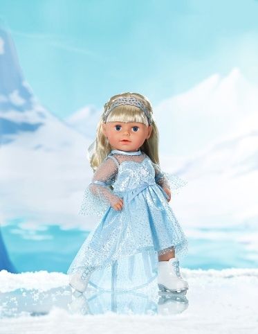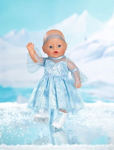 BABY born ve třpytivých šatech pro ledové princezny nejde přehlédnout. V krásných bruslích snadno klouže po zamrzlém jezeře s Teddym a Carlou. K šatům patří i diadém, který skvěle drží na hlavě během všech piruet.