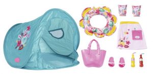 BABY born Souprava s plážovým stanem. Součástí balení je stan, gumový kruh, rukávky, osuška, pantofle, plážová taška a 2 láhve.