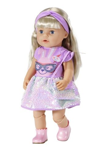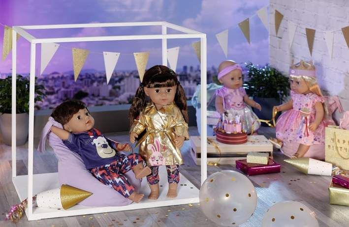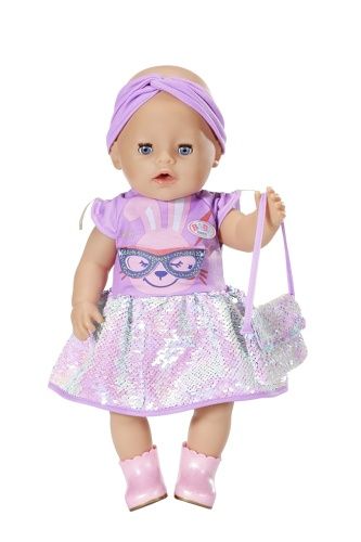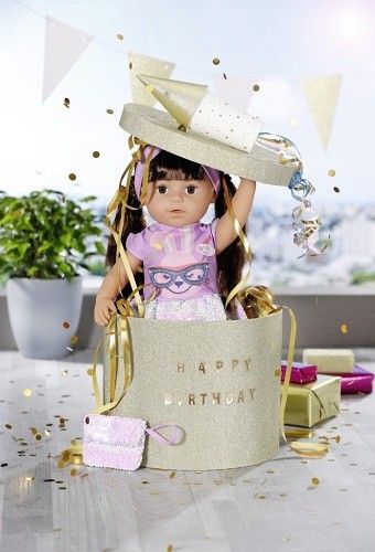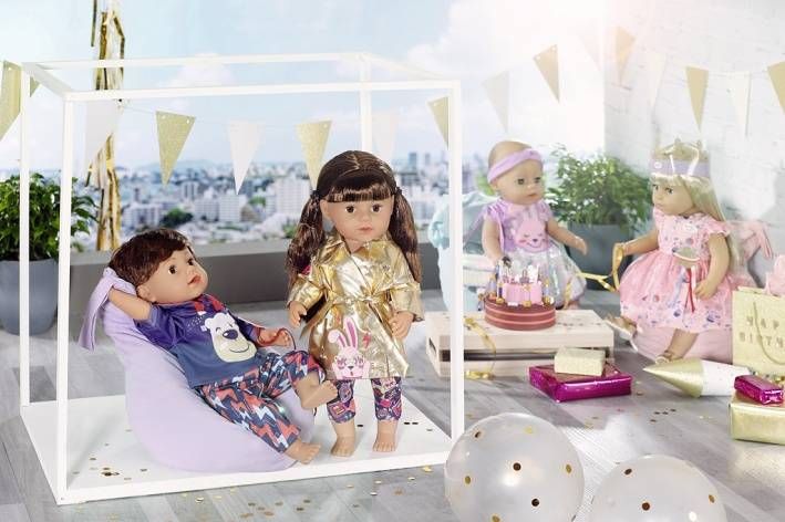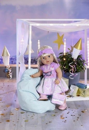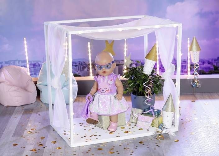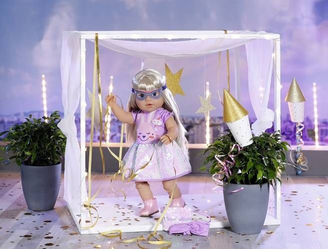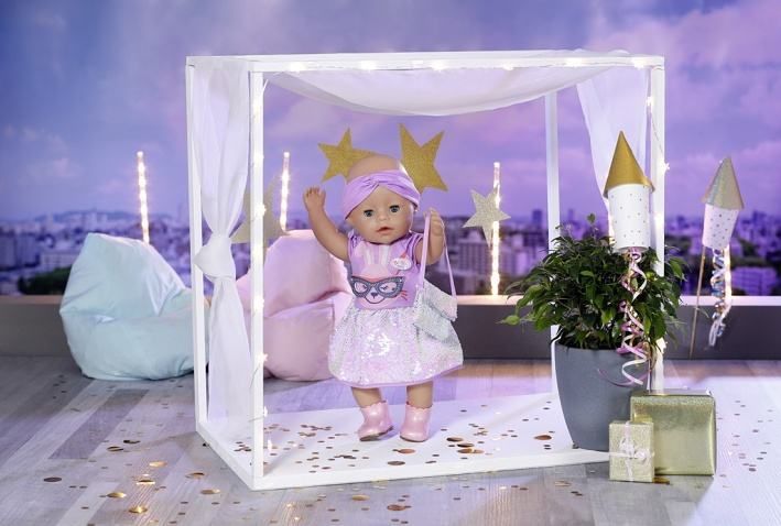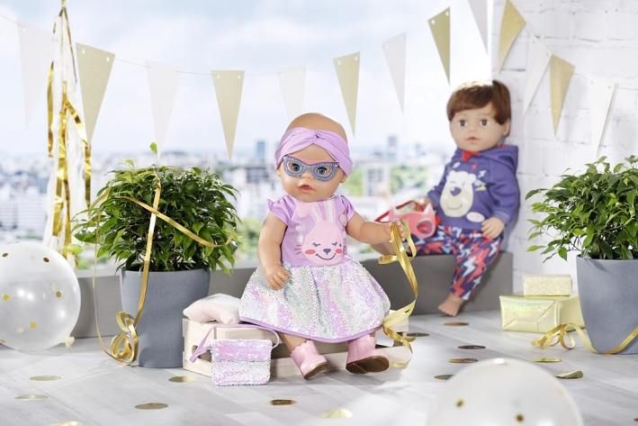 „Kdepak jsem jen nechala brýle?“ Ano, ve „30 letech“ tato otázka už může zaznít. BABY born, malá párty princezna, slaví výročí 30 let panenky. Modrou masku lze nosit jako brýle s páskem kolem hlavy a může rovněž sloužit jako stylový doplněk pro zajíčka Benna na šatičkách. Zajíček se konec konců také rád zúčastní narozeninové oslavy. Šatičky mají sukni z oboustranných pajetek. Flitry je ozdobena i kabelka BABY born. Na hlavě má BABY born čelenku s velmi módním vzhledem. Narozeninový model doplňují růžové kotníkové boty. • Kvalitní oblečení pro originální panenku BABY born. • Pro radost z nápadité, rozmanité a dlouhotrvající hry. • Velmi snadné převlékání. BABY born Souprava se šatičkami Deluxe Narozeninová edice pro panenky velikosti 43 cm. Součástí jsou šatičky, čelenka, boty, stylová maska a kabelka.