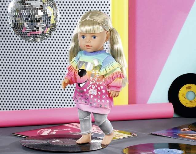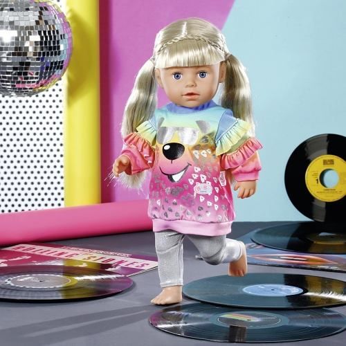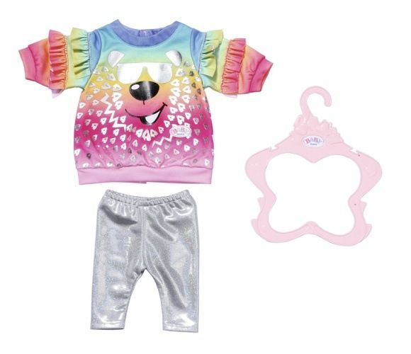 Volné svetry jsou jedním z nejnovějších módních trendů. Starší sestřička BABY born má jeden takový opravdu stylový. Svetr v duhových barvách je potištěn krásným třpytivým motivem a na rukávech ho zdobí volánky. Ke svetru se perfektně hodí stříbrné legíny. • Originální obleček pro panenky BABY born. • Pro nápaditou, rozmanitou a dlouhotrvající hru. • Vhodný pro všechny panenky BABY born ve velikosti 43 cm. BABY born Starší sestřička Oblečení se svetříkem pro panenky ve velikosti 43 cm. Součástí je ramínko.