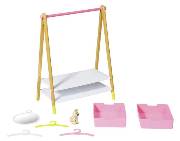 Pejsek Bello nyní pracuje pro módní policii. Z nejvyššího bodu stojanu na oblečení doma hlídá všechnu módu pro BABY born a ostražitě pozoruje nové modely. V zrcadle, které lze sundat, si může malá parádnice prohlédnout své outfity na sobě. Stojan na oblečení ve skandinávském stylu má vzpěry ve vzhledu dřeva. Na růžovém příčníku jsou zavěšena tři barevná ramínka na šaty. Kromě odkládacího místa na polici nabízejí spoustu místa na doplňky a další maličkosti dvě růžové přihrádky.