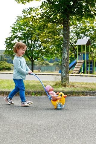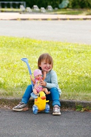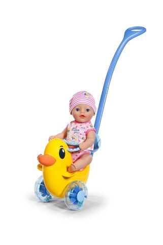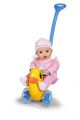 BABY born Strkadlo Berta s nastavitelným opěradlem a odnímatelnou vodící tyčí. • Přizpůsobí se výšce dítěte: S odnímatelnou a nastavitelnou vodící tyčí. • Chrastící kolečka: Průhledná modrá kolečka jsou naplněna korálky. • Vhodná pro všechny: Díky nastavitelnému opěradlu a upevňovacímu madlu se na sedátko vejde každá panenka BABY born. • Pod sedátkem je ukryta tajná přihrádka na malé poklady. • Kvalitní doplněk pro radost z nápadité, rozmanité a dlouhotrvající hry.