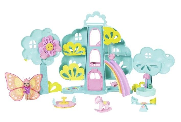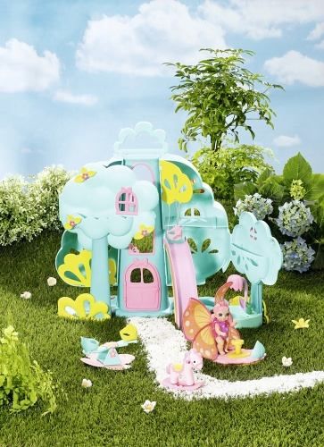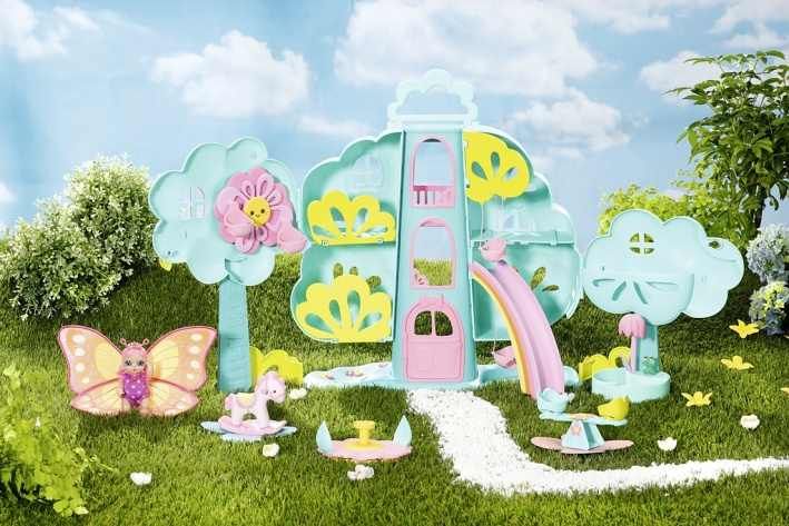 Čáp a datel společně postavili stromový domeček. Ve dvoupatrovém domečku bydlí exkluzivní miminko BABY born Surprise v roztomilém růžovém body a třpytivými žluto-oranžovými křídly. V domečku i kolem je opravdový zábavní park. Miminka můžou vyjet výtahem do horního patra, kde je zavěšena houpačka a nainstalován kolotoč. Zpátky dolů na zahradu se svezou po duhové skluzavce. Na zahradě se miminka můžou houpat pod skluzavkou, na houpacím koníkovi, na dvouramenné houpačce nebo se svézt na kolotoči. Květinková sprcha s žabí pumpou poskytuje vítané ochlazení opravdovou vodou. Hraní v zábavním parku skončilo? Stromový domeček můžeš jednoduše složit, aby se doma ušetřilo místo nebo jej vzít na návštěvu ke kamarádům. Na přenášení slouží praktické madlo. • Doplněk pro miminka BABY born Surprise. • Pro hraní a sbírání. • Různorodé hry s miminky BABY born Surprise zvyšují představivost a bylo prokázáno, že podporují rozvoj společenských dovedností a hodnot jako je zodpovědnost, komunikace a empatie. BABY born Surprise Stromový domeček. Součástí je exkluzivní miminko BABY born Surprise.
