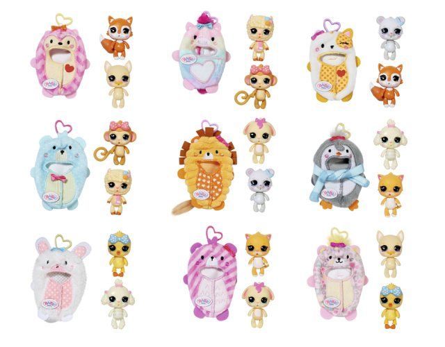 BABY born Surprise Zvířátka (1. série) ve fusáčku se sponou na zavěšení, dudlíkem, rodným listem a přehledem všech zvířátek. 18 druhů.