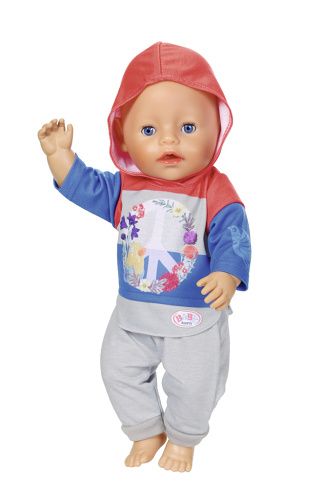 Panenka BABY born, její starší sestřička i bratříček mají ráditeplákovou soupravu. Je tak pohodlná! Můžou si ji snadno a rychlepřevléknout a je skvělá pro každou příležitost. K dispozici je ve dvouvariantách. Jedna má šedé tepláky a červeno-modro-šedou mikinu s kapucía potiskem květinového „peace“ symbolu. Druhá varianta nabízí krásněkvětované tepláky a růžovo-oranžovo-šedou mikinu do barvy a s hezkýmpotiskem. • Originální obleček pro panenky BABY born • Pečlivěnavržené doplňky rozvíjejí dětskou představivost a otevírají novémožnosti a témata hry • Snadno se převléká BABY born Teplákovka propanenky ve velikosti 43 cm ve dvou variantách, v každé variantě najdetemikinu s kapucí a tepláky. Součástí je ramínko.
