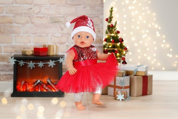 BABY born se o Vánocích ráda slavnostně obléká. A co může být hezčího než červené šaty s flitry a s tylovou sukýnkou, stříbrnými legínami a vánoční čepicí, která zahřeje uši?