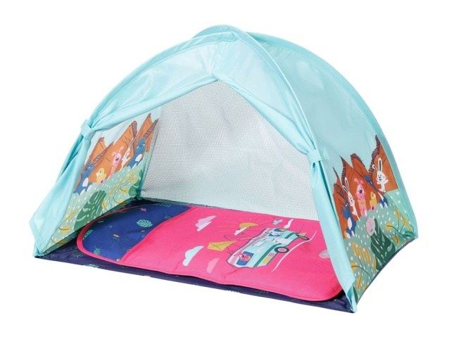 Sledovat východ slunce přímo z postýlky je prostě úžasné. BABY born si proto v předvečer najde v ústraní zahrady tichý koutek a postaví si tam svůj stan v tyrkysové barvě. Na vnější straně stanu jsou vyobrazeni její zvířecí kamarádi, jak si užívají výlet v horách. Nad plápolajícím táborákem si BABY born opéká marshmallow a k tomu pije bylinkovou limonádu. Potom se zachumlá do svého růžového spacáku a stráví noc na čerstvém vzduchu. Když ráno u sousedů zakokrhá kohout, rozhrne přední stěny stanu a nadšeně pozoruje růžovo-modré nebe a vycházející slunce.