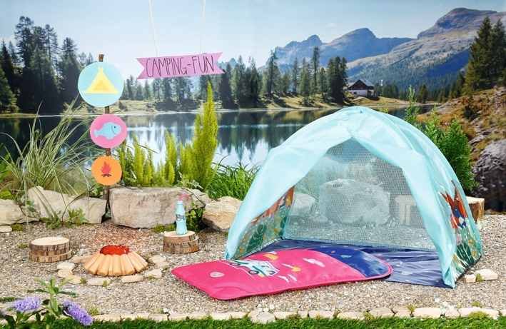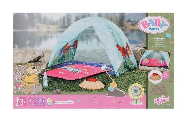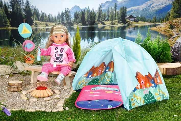 Sledovat východ slunce přímo z postýlky je prostě úžasné. BABY born si proto v předvečer najde v ústraní zahrady tichý koutek a postaví si tam svůj stan v tyrkysové barvě. Na vnější straně stanu jsou vyobrazeni její zvířecí kamarádi, jak si užívají výletu v horách. Nad plápolajícím táborákem si BABY born opéká marshmallow ak tomu pije bylinkovou limonádu. Pak se zachumlá do svého růžového spacáku a stráví noc na čerstvém vzduchu. Když ráno u sousedů zakokrhá kohout, rozhrne přední stěny pozoru a nad. • Kvalitní příslušenství pro originální panenku BABY born. • Pro radost z nápadité, rozmanité a dlouhotrvající hry. • Vhodné pro panenku velikosti 36 cm a 43 cm. BABY born Víkendová Sada ke kempování obsahuje stan, spacák, táborák, marshmallow a láhev limonády. Na baterie: 3x AAA (nejsou součástí balení)