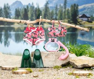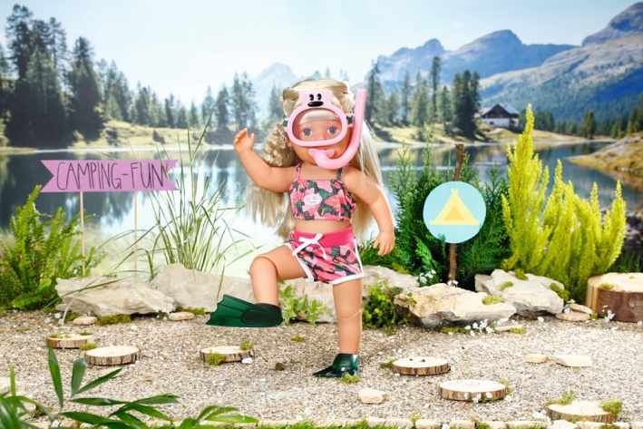 Ale to se BABY born šla potápět a to, co je vidět na vodní hladině, je šnorchl její medvídkové šnorchlovací masky. Do výbavy patří i zelené ploutve. Stejnou zelenou barvu jako mají ploutve najdeme i na bikinách. Nařasený horní díl plavek a šortky jsou potištěny vodními rostlinami.