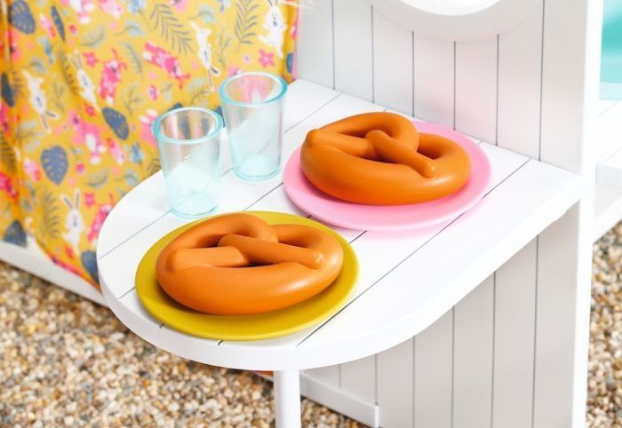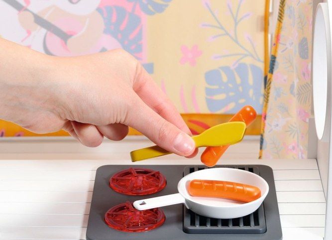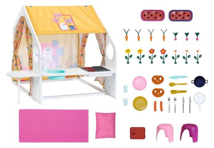 Když k víkendovému domku dorazí, tak nejdříve otevřou žluté boční stěny, aby bylo na vše dost místa. Pak se postarají o květiny v truhlících a sklidí zeleninu k večeři. Zatímco se na sporáku připravuje jídlo, BABY born prostírá stůl. Podává se salát z mrkve a ředkviček a nechybí ani párky a preclíky. Po jídle je samozřejmě třeba umýt nádobí.