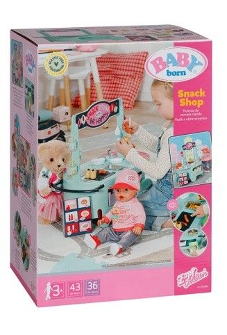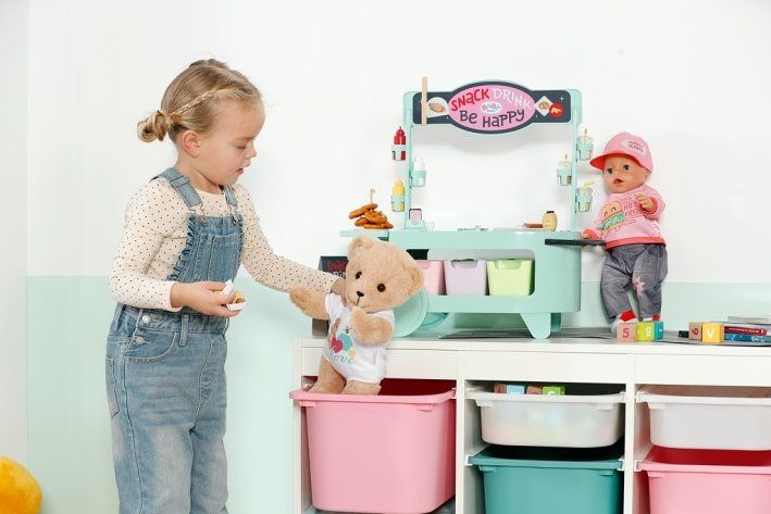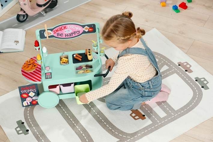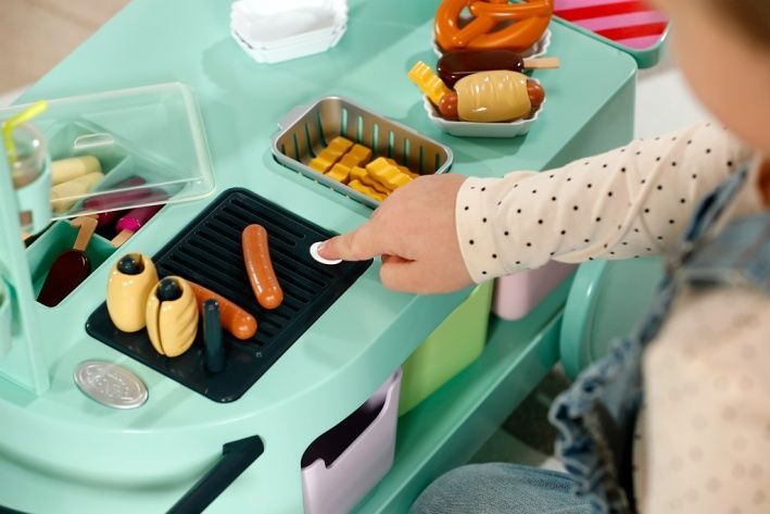 • Barevný vozík s občerstvením, s melodií a zvukovými efekty • Mnoho doplňků pro dlouhotrvající hru • S grilem a zásobníkem na led • Pohyblivá kolečka • Lze rozložit a uložit, abyste doma ušetřili místo • Rozměry: 39 × 20 × 27 cm Na baterie: 3x AA (nejsou součástí balení)