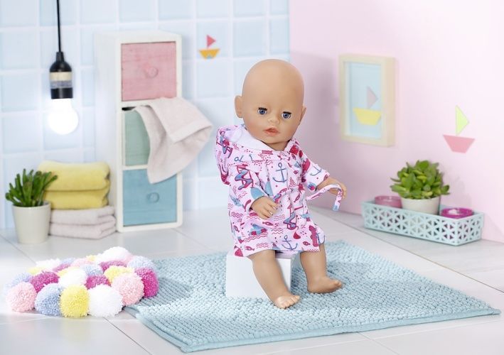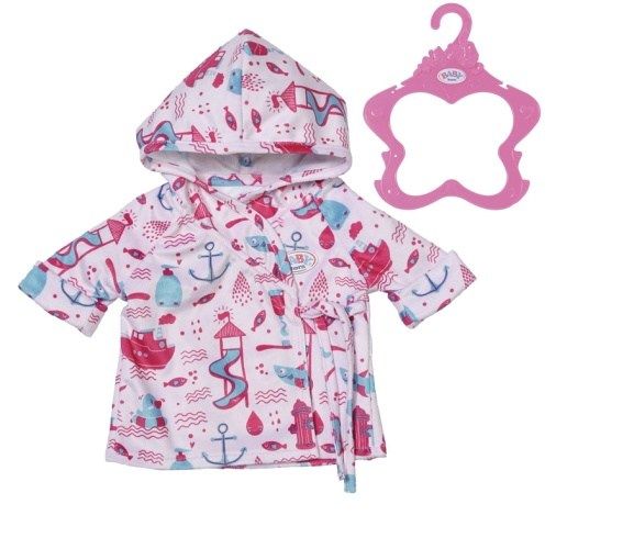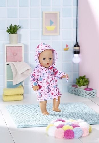 Lodě, kormidlo, skluzavky, kačenky do vany, hydranty, mušle, ryby, vlny, vítr a spousta dalšího, to vše najdete v akvaparku. Stejně jako na županu BABY born. Panenka se po koupání nebo plavání nejraději zachumlá do měkkého župánku, nasadí si kapuci a sní o mořských hvězdách a mořských pannách. • Kvalitní oblečení pro originální panenku BABY born. • Pro radost z nápadité, rozmanité a dlouhotrvající hry. • Velmi snadné převlékání. BABY born Župan pro panenky velikosti 43 cm. Včetně ramínka.