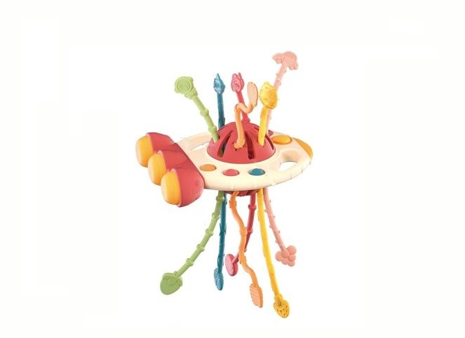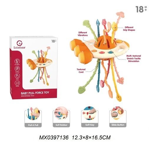 Různé tvary úchopu, texturované šňůry, hmatová stimulace pomocí více strečových textur. Tahejte, měkká guma, jemné tlačítko, posunovací tlačítko. Podporuje jemnou motoriku, myšlení, ruce a smysly.
